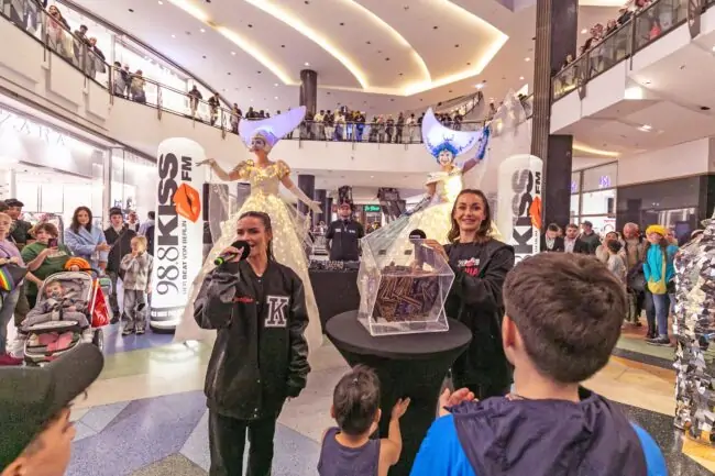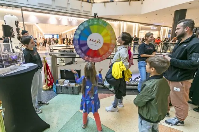 Mit der Moderator-Power unseres Medienpartners, dem Radiosender KISS FM, promoteten wir zudem das große ALEXA-Gewinnspiel. Alle Teilnehmer konnten sich einen kleinen Preis an zwei Glückrädern außerhalb und innerhalb des Centers „erdrehen“. Zusätzlich bestand für alle die Chance, sich durch den Einwurf eines personalisierten Flyers in die Losbox einen Hauptgewinn bei der späteren Ziehung auf dem Metropolis Court im ALEXA zu sichern.